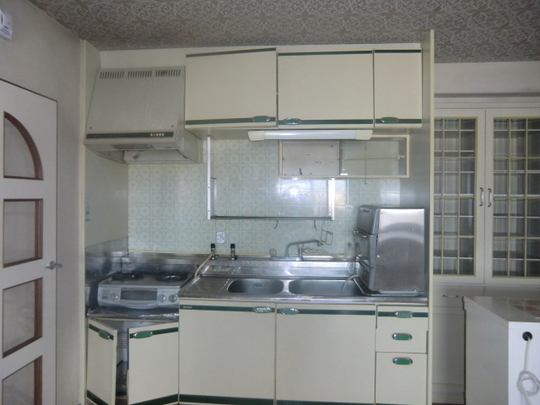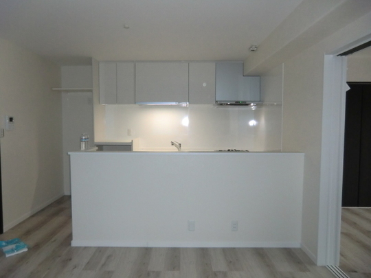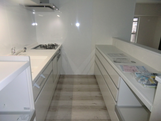 本来は対面式でリビング側にシンクやコンロを設置したいとのご要望ですが残念ながら床の高さがシンクの排水管を設置できる程の高さがなかったのでリビング側はカウンタ収納ーを設置いたしました