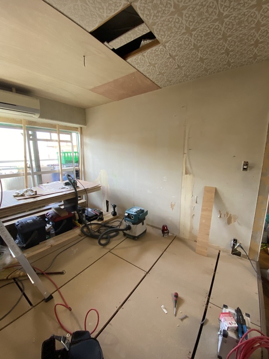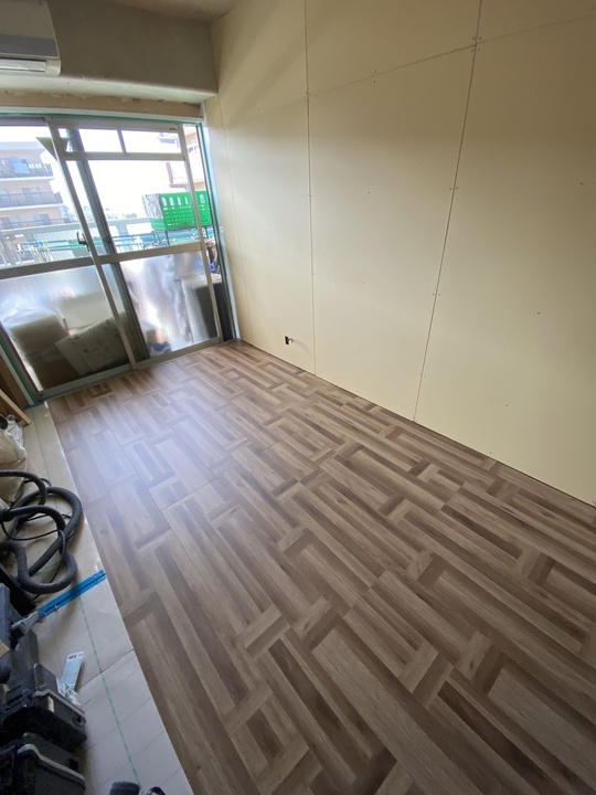 床上げの理由は電気の線を床下に通したいのと、直貼りフロアはキャスターの椅子を使えない商品が多いという理由で床上げ後、耐キャスターのフローリングを施工することにしました。
