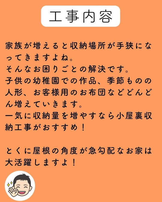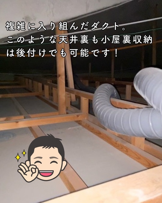 天井裏に収納スペースを作ることで、物理的に収納力を確保することができるため、このリフォームは非常に効果的です。