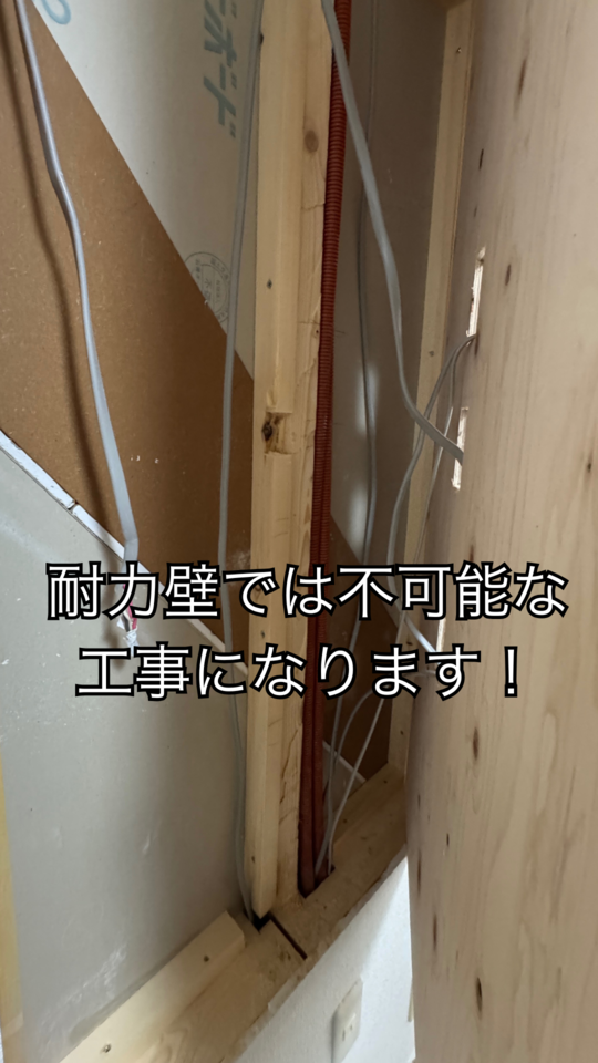一般的な石膏ボードの壁で、内部に配管・配線の通るスペースあり。下地探知と構造確認を行い、耐力壁ではないことを確認して開口位置とサイズを決定。