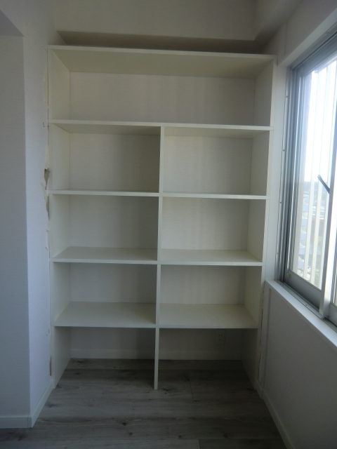 1番上の棚の幅と床面の幅は15mmも違っていましたが造り付けで現地工事なので隙間なく完成。