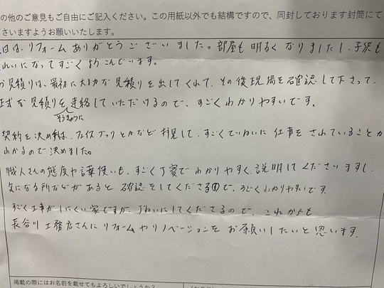 すごく工事がしにくい家ですが丁寧にしてくださるのでこれからも長谷川工務店さんにリフォームやリノベーションをお願いしたいと思います。